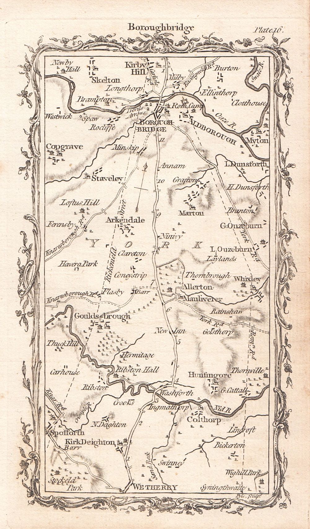 A scarce antique road map from "An Actual Survey of the Great Post-Roads between London and Edinburgh" by Mostyn John Armstrong, published in 1776. Each map shows a section of the road from London to Edinburgh drawn on the scale of half an inch to the mile. These maps are not strip road maps, but take the form of a conventional map covering an area of approximately 12 miles from south to north and 7 miles east to west. This is Plate 16 - Wetherby, Boroughbridge, Kirby Hill. Includes free mounting on request.