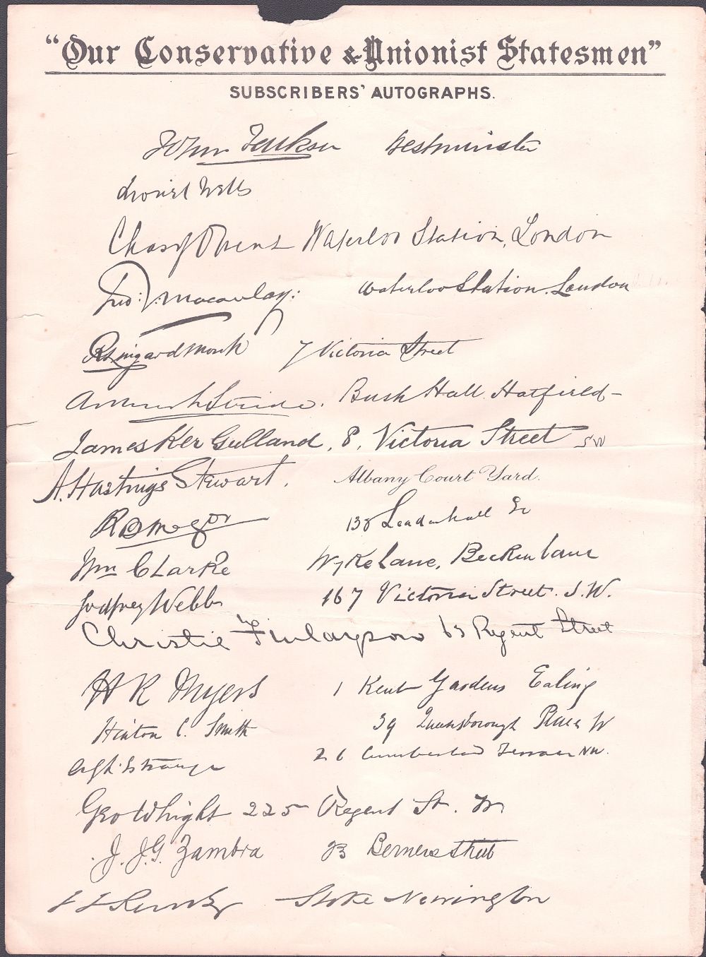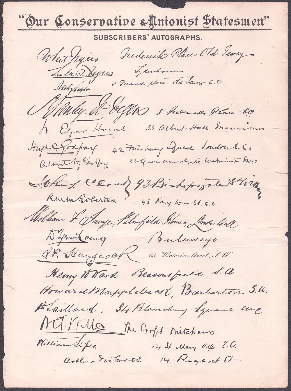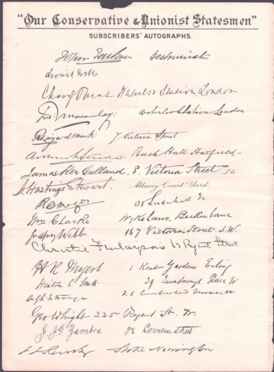 A double sided page bearing a collection of facsimilie of 'Subscribers' Autographs' and their addresses of Conservative subscribers. Published in 1905. Horizontal centrefold.Approx 25cms by 35cms.