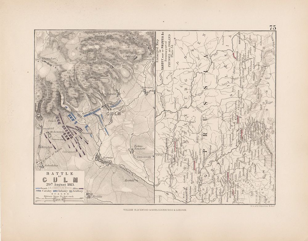 An antique plan of "Battle of Culm. 29th August, 1813" by Alexander Keith Johnston. F.R.G.S. published by William Blackwood and Sons in 1848 with original colouring. The plan shows the positions of the Allies and the French Cavalry, Infantry and Artillery. Also attached is an 'Enlarged Map of part of Saxony, part of Prussia &c....'