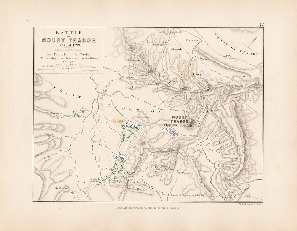 An antique plan of "Battle of Mount Thabor. 16th April, 1799. " by Alexander Keith Johnston. F.R.G.S. published by William Blackwood and Sons in 1848 with original hand colouring. Shows the positions of the French and Turks Cavalry, Infantry and Artillery. Resulted in an French victory.