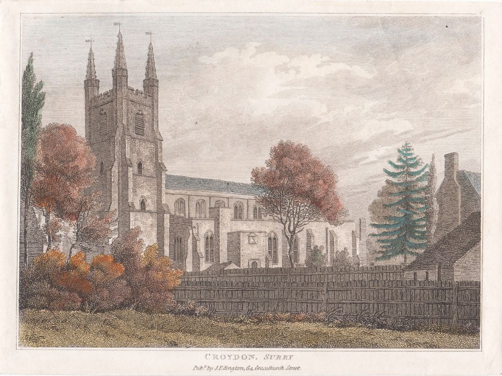 An antique line engraving published by J. Edington, 64, Gracechurch Street. Circa 1820 with later hand colouring. This is St John the Baptist Church at Croydon , rebuilt in 1870 after a fire by Sir George Gilbert Scott.Approx 18.5cms by 13.5cms.