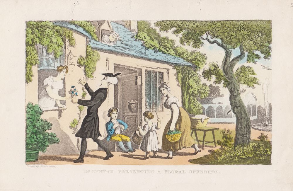 Home Antique Prints Caricatures (antique prints) Thomas Rowlandson and Dr Syntax Dr. Syntax presenting a floral offering. (antique print)