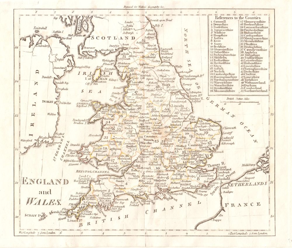 An antique map of England and Wales which was engraved for Walker's Geography. Circa 1810. Approx 21.5cms by 19cms.