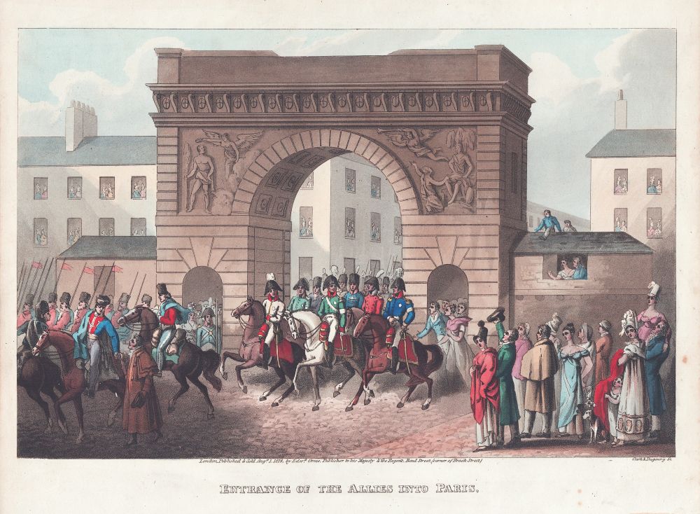 An antique aquatint engraving by John Heaviside Clark and Matthew Dubourg . Published by Edward Orme in 1819 with original hand colouring. It portrays the 1814 entry of Allied forces (Russia, Prussia, Austria) into Paris, which led to Napoleon's abdication. Some marginal soiling.