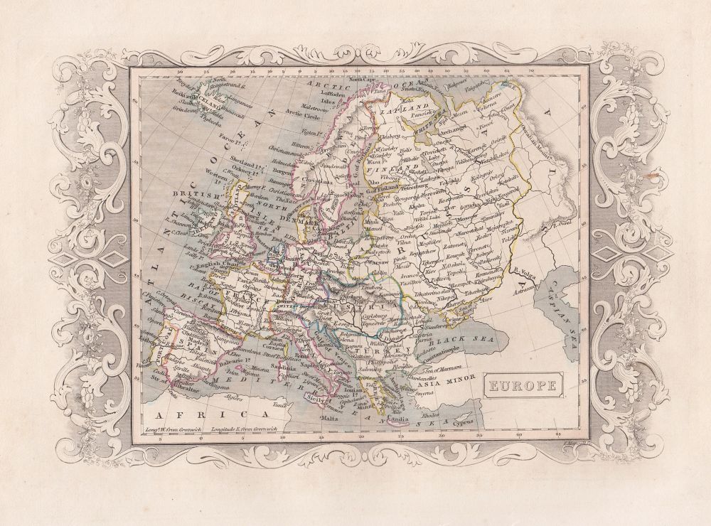 An antique map of Europe engraved by F. Mansell. Circa 1850 with contemporary outline colouring. Decorative border.Approx ,21cms by14cms