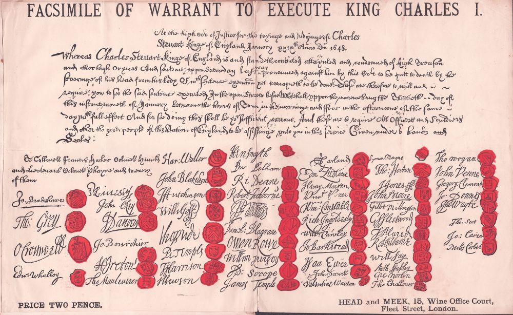 Printed and Published by Head and Meek, 15, Wine Office Court, Fleet Street, London. 'Price Two Pence'. Circa 1860? The text of the warrant reads as follows :- "Whereas Charles Stewart King of England is and standeth attainted and condemned of high Treason and other high Crymes, And sentence was pronounced against him by this Court to be putt to death by the severinge of his head from his body Of which execution yet remayneth to be done, These are therefore to will and require you to see the said sentence executed In the open Streete before Whitehall upon the morrowe being the Thirtieth day of this instante moneth of January betweene the houres of Tenn in the morning and Five in the afternoone of the same day with full effect And for soe doing this shall be your sufficient warrant And these are to require All Officers and Soldiers and other the good people of this Nation of England to be assisting unto you in this service Given under our hands and Seales."