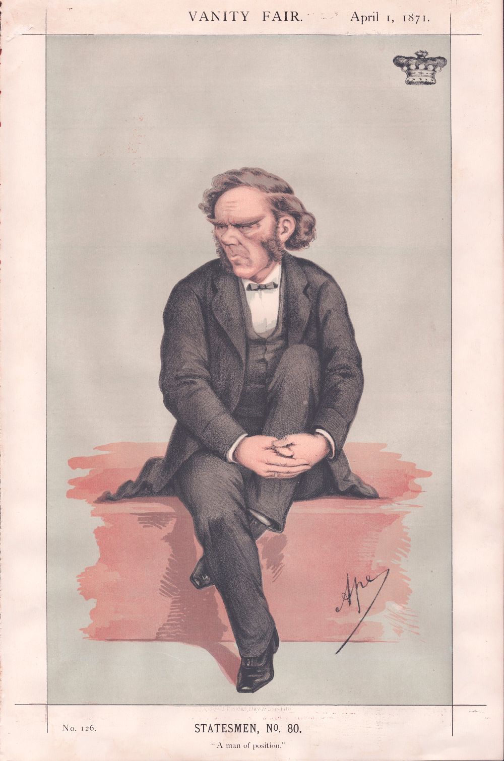 An antique print entitled " A Man of position. " was produced for the famous Victorian Magazine "Vanity Fair" founded by Thomas Gibson Bowles which commenced publication in 1869. The prints were produced in colour by chromo-lithography by Vincent Brooks, and Day and Son. For about forty five years caricatures of famous and infamous personalities were carried in the weekly issues of Vanity Fair. Subjects included Royalty, judges, politicians, musicians, sportsmen, artists, actors and criminals of Victorian and Edwardian Britain. This print by 'Ape' was published on April 1st, 1871.