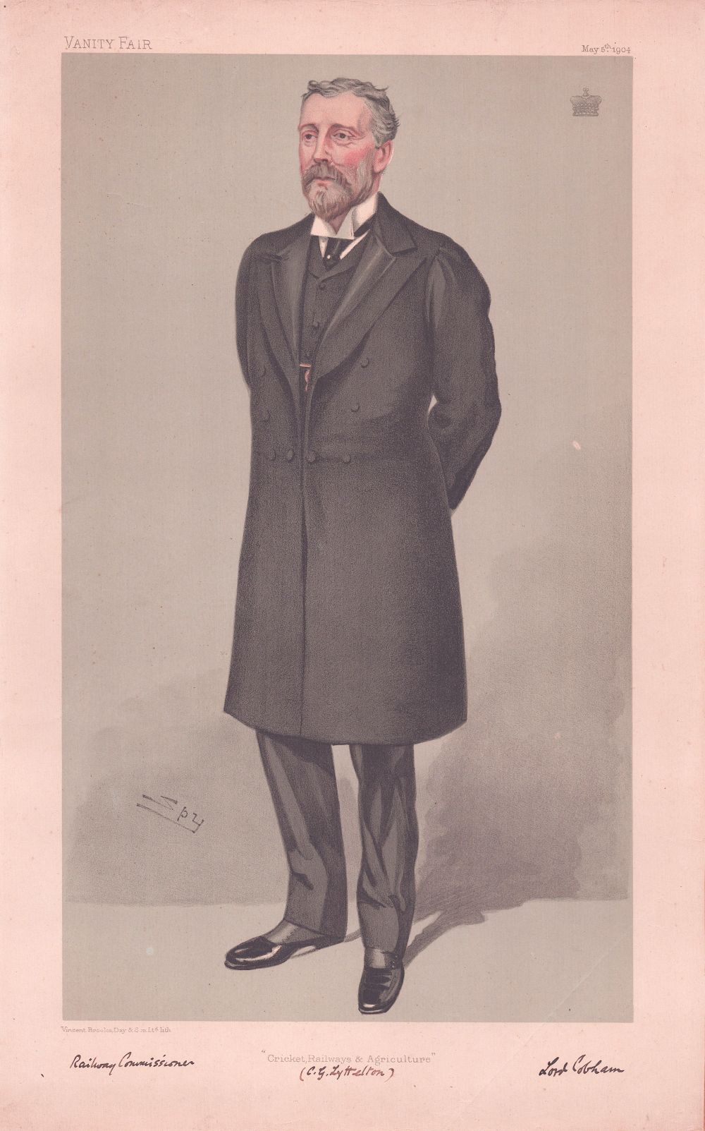 An antique print entitled " Cricket, Railways & Agriculture.. " was produced for the famous Victorian Magazine "Vanity Fair" founded by Thomas Gibson Bowles which commenced publication in 1869. The prints were produced in colour by chromo-lithography by Vincent Brooks, and Day and Son. For about forty five years caricatures of famous and infamous personalities were carried in the weekly issues of Vanity Fair. Subjects included Royalty, judges, politicians, musicians, sportsmen, artists, actors and criminals of Victorian and Edwardian Britain. This print by 'Spy' was published on May 5th, 1904.