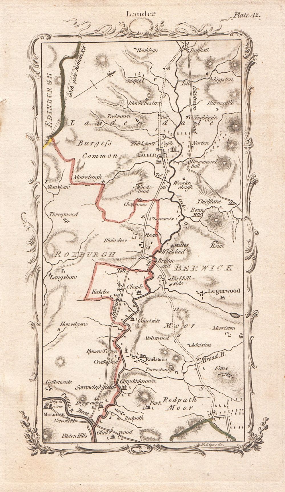 A scarce antique road map from "An Actual Survey of the Great Post-Roads between London and Edinburgh with the Country three Miles on each side" by Mostyn John Armstrong, published in 1776. Each map shows a section of the road from London to Edinburgh drawn on the scale of half an inch to the mile. These maps are not strip road maps, but take the form of a conventional map covering an area of approximately 12 miles from south to north and 7 miles east to west. This is Plate 42 - Redpath Moor, Birkhill, Lauder. Includes free mounting on request.