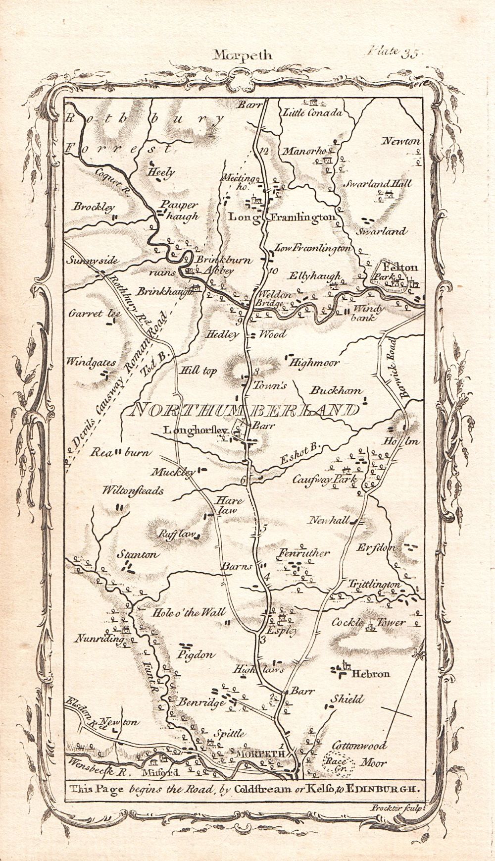 A scarce antique road map from "An Actual Survey of the Great Post-Roads between London and Edinburgh with the Country three Miles on each side" by Mostyn John Armstrong, published in 1776. Each map shows a section of the road from London to Edinburgh drawn on the scale of half an inch to the mile. These maps are not strip road maps, but take the form of a conventional map covering an area of approximately 12 miles from south to north and 7 miles east to west. This is Plate 35 - From Morpeth to Longhorsley to Long Framlington. Includes free mounting on request.