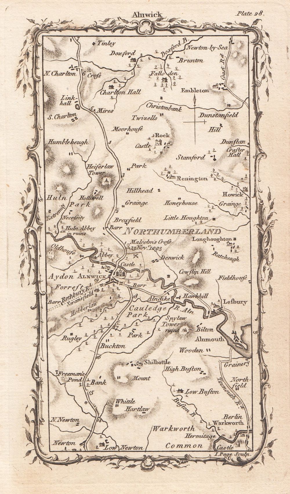 A scarce antique road map from "An Actual Survey of the Great Post-Roads between London and Edinburgh with the Country three Miles on each side" by Mostyn John Armstrong, published in 1776. Each map shows a section of the road from London to Edinburgh drawn on the scale of half an inch to the mile. These maps are not strip road maps, but take the form of a conventional map covering an area of approximately 12 miles from south to north and 7 miles east to west. This is Plate 28 - Alnwick. Includes free mounting on request.