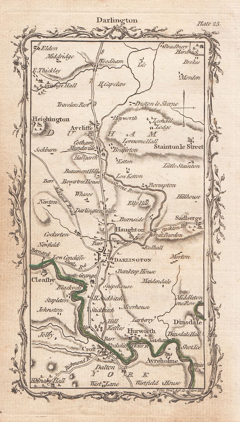 A scarce antique road map from "An Actual Survey of the Great Post-Roads between London and Edinburgh with the Country three Miles on each side" by Mostyn John Armstrong, published in 1776. Each map shows a section of the road from London to Edinburgh drawn on the scale of half an inch to the mile. These maps are not strip road maps, but take the form of a conventional map covering an area of approximately 12 miles from south to north and 7 miles east to west. This is Plate 26 - Croft, Darlington, Aycliffe. Includes free mounting on request.