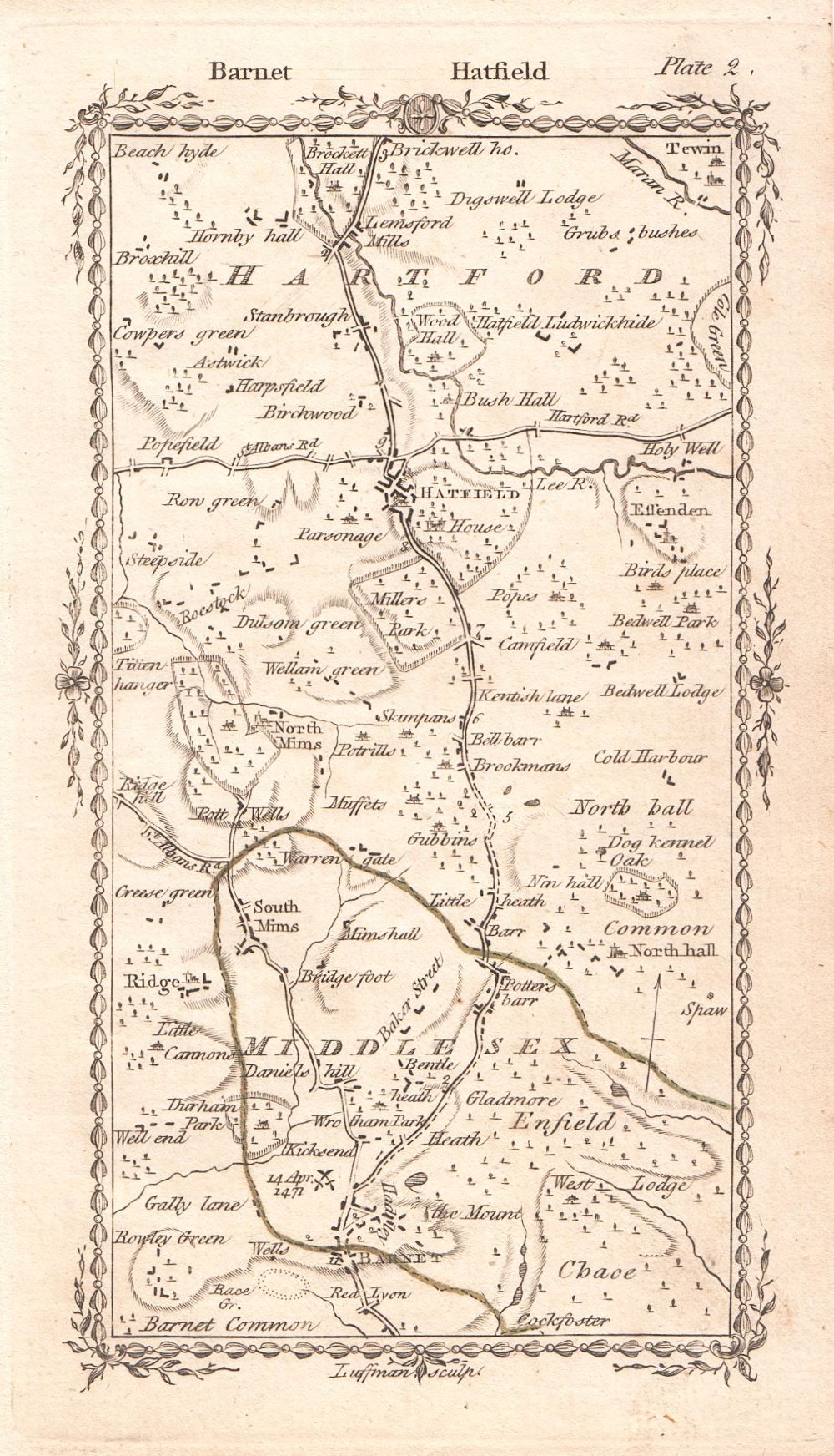 A scarce antique road map from "An Actual Survey of the Great Post-Roads between London and Edinburgh" by Mostyn John Armstrong, published in 1776. Each map shows a section of the road from London to Edinburgh drawn on the scale of half an inch to the mile. These maps are not strip road maps, but take the form of a conventional map covering an area of approximately 12 miles from south to north and 7 miles east to west. This is Plate 2 - Barnet, Potters Bar, Hatfield. Includes free mounting on request.