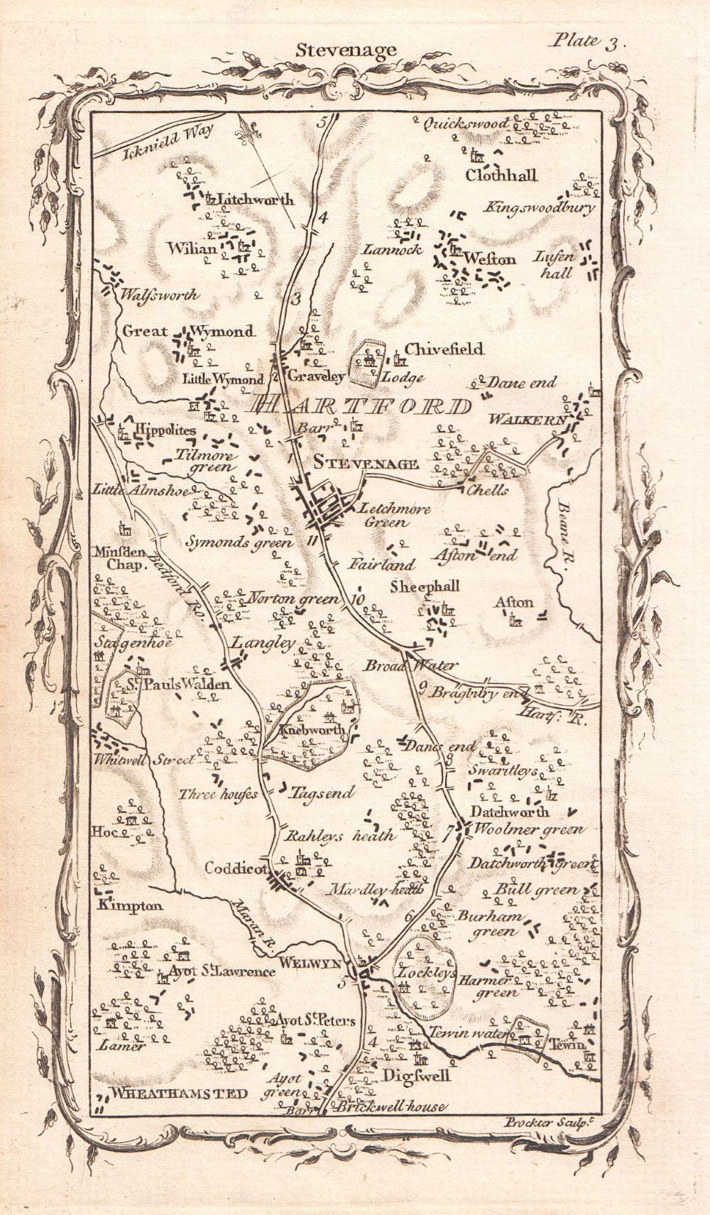 A scarce antique road map from "An Actual Survey of the Great Post-Roads between London and Edinburgh" by Mostyn John Armstrong, published in 1776. Each map shows a section of the road from London to Edinburgh drawn on the scale of half an inch to the mile. These maps are not strip road maps, but take the form of a conventional map covering an area of approximately 12 miles from south to north and 7 miles east to west. This is Plate 3 - Welwyn to Stevenage.. Includes free mounting on request.