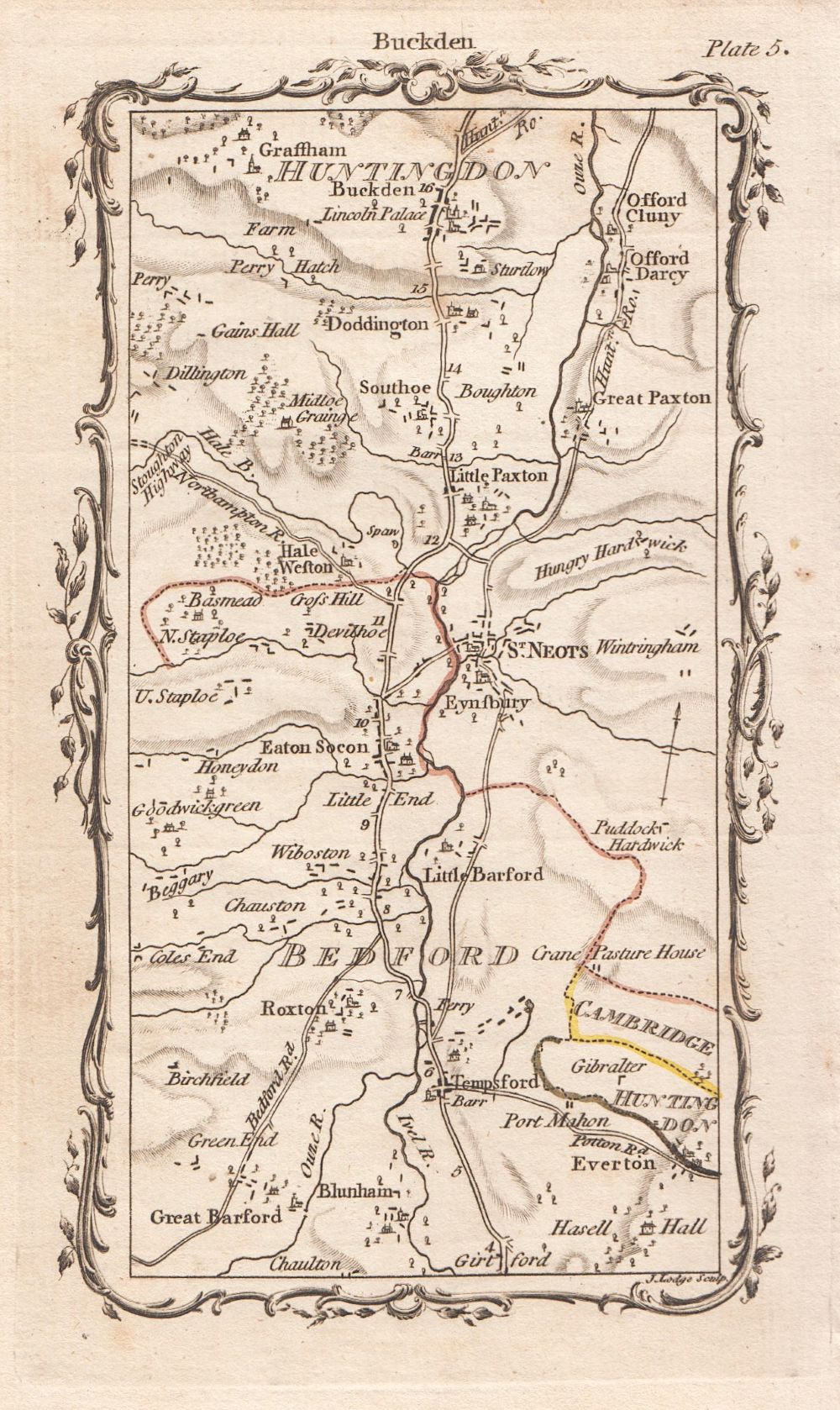 A scarce antique road map from "An Actual Survey of the Great Post-Roads between London and Edinburgh" by Mostyn John Armstrong, published in 1776. Each map shows a section of the road from London to Edinburgh drawn on the scale of half an inch to the mile. These maps are not strip road maps, but take the form of a conventional map covering an area of approximately 12 miles from south to north and 7 miles east to west. This is Plate 5 - Tempsford, St. Neots, Little Paxton to Buckden. Includes free mounting on request.