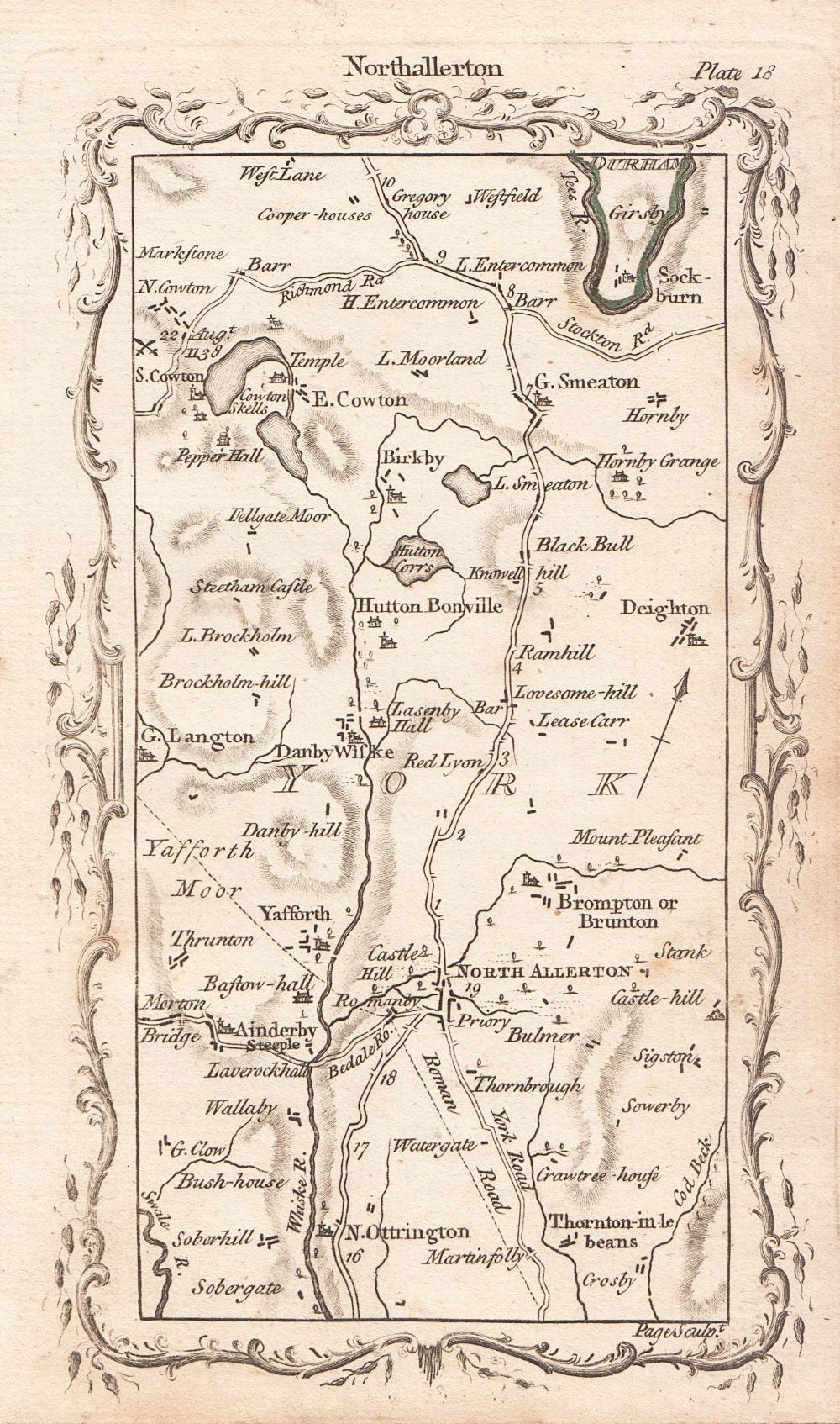 A scarce antique road map from "An Actual Survey of the Great Post-Roads between London and Edinburgh with the Country three Miles on each side" by Mostyn John Armstrong, published in 1776. Each map shows a section of the road from London to Edinburgh drawn on the scale of half an inch to the mile. These maps are not strip road maps, but take the form of a conventional map covering an area of approximately 12 miles from south to north and 7 miles east to west. This is Plate 19 - N. Ottrington, North Allerton, G. Smeaton. Includes free mounting on request.