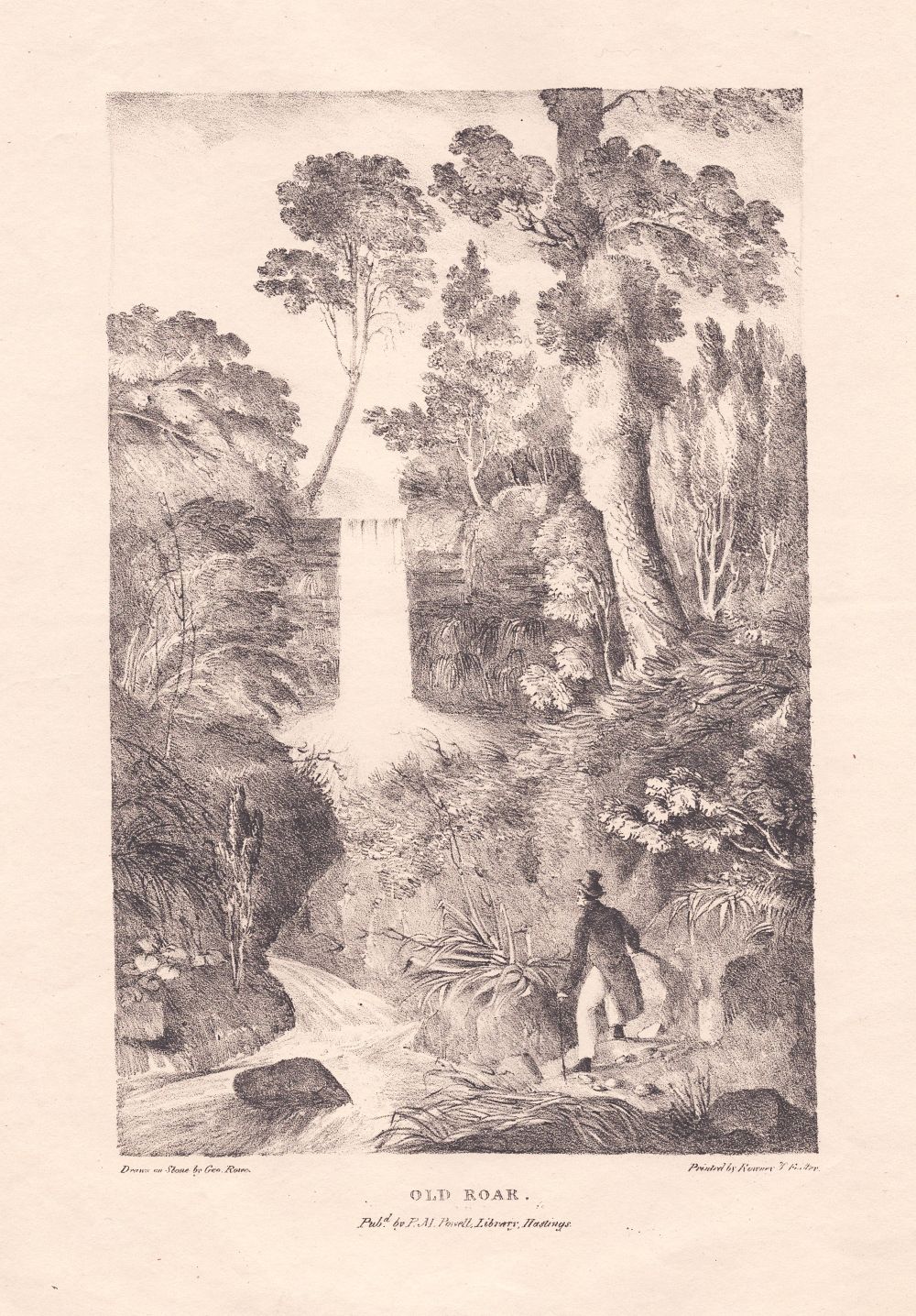 An antique lithograph 'Drawn on Stone by Geo. Rowe' and published by P.M. Powell Library, Hastings. Circa 1840.Approx 17cms by 25cms.
