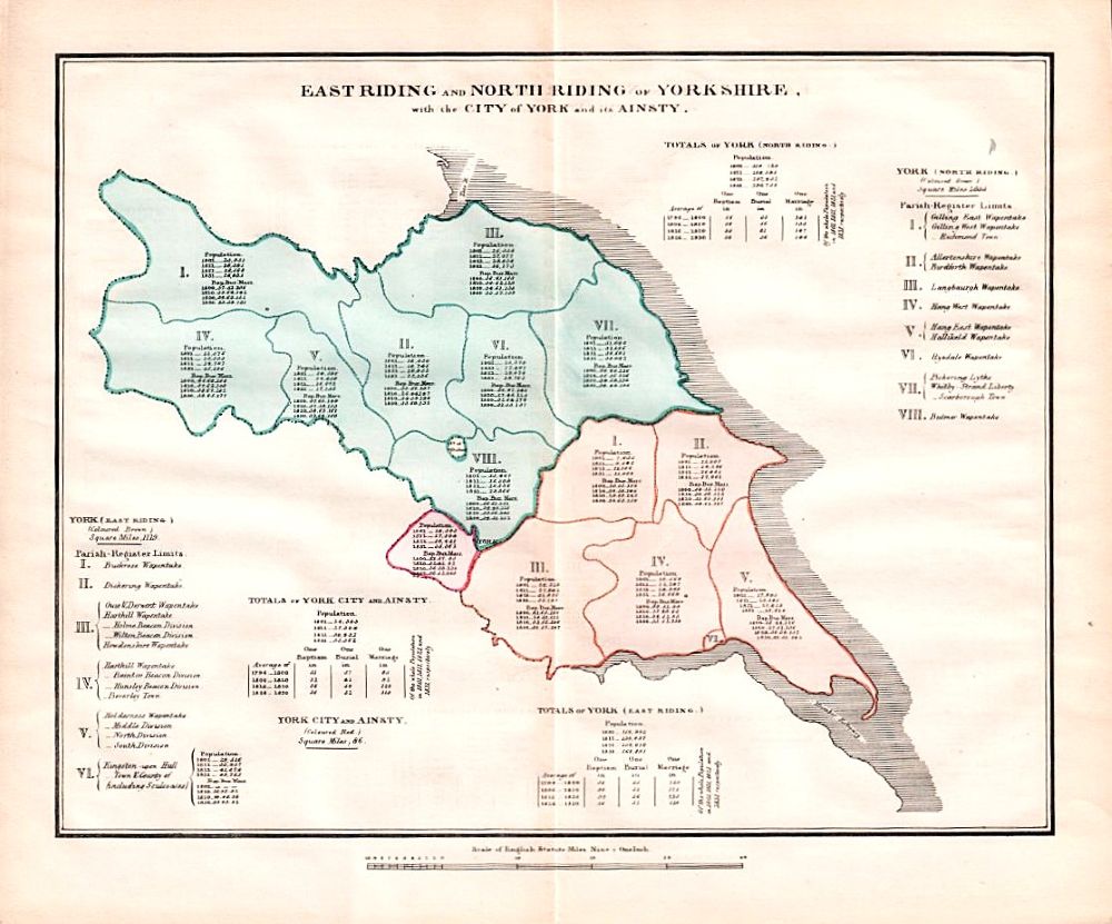 ... with the City of York and its Ainsty. An antique map published in "Abstract of the Answers and Returns Made pursuant to an Act, passed in the Eleventh Year of the Reign of His Majesty King George IV, intituled "An Act for taking an Account of the Population "of Great Britain, and of the Increase or Diminution thereof". Published in 1831 with contemporary hand colouring. Ordered, by the House of Commons, to be Printed 2 April, 1833.