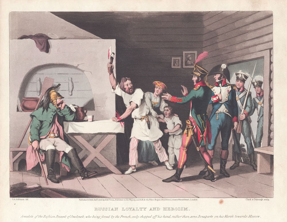 "Anecdote of the Russian Peasant of Smolensk who being forced by the French, cooly chopped off his hand, rather than serve Bonaparte on his march towards Moscow." An aquatint engraving by John Heaviside Clark and Matthew Dubourg after John Augustus Atkinsonfrom a sketch by an officer. Published by Edward Orme in 1819 with original hand colouring.