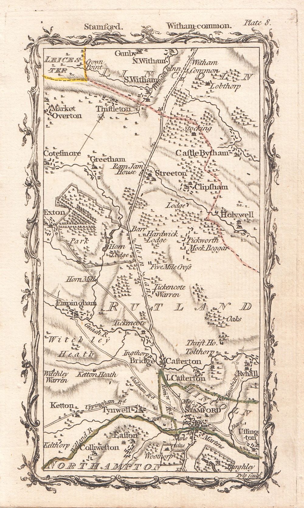 A scarce antique road map from "An Actual Survey of the Great Post-Roads between London and Edinburgh" by Mostyn John Armstrong, published in 1776. Each map shows a section of the road from London to Edinburgh drawn on the scale of half an inch to the mile. These maps are not strip road maps, but take the form of a conventional map covering an area of approximately 12 miles from south to north and 7 miles east to west. This is Plate 8 - Stamford, Casterton to Witham Common. Includes free mounting on request.