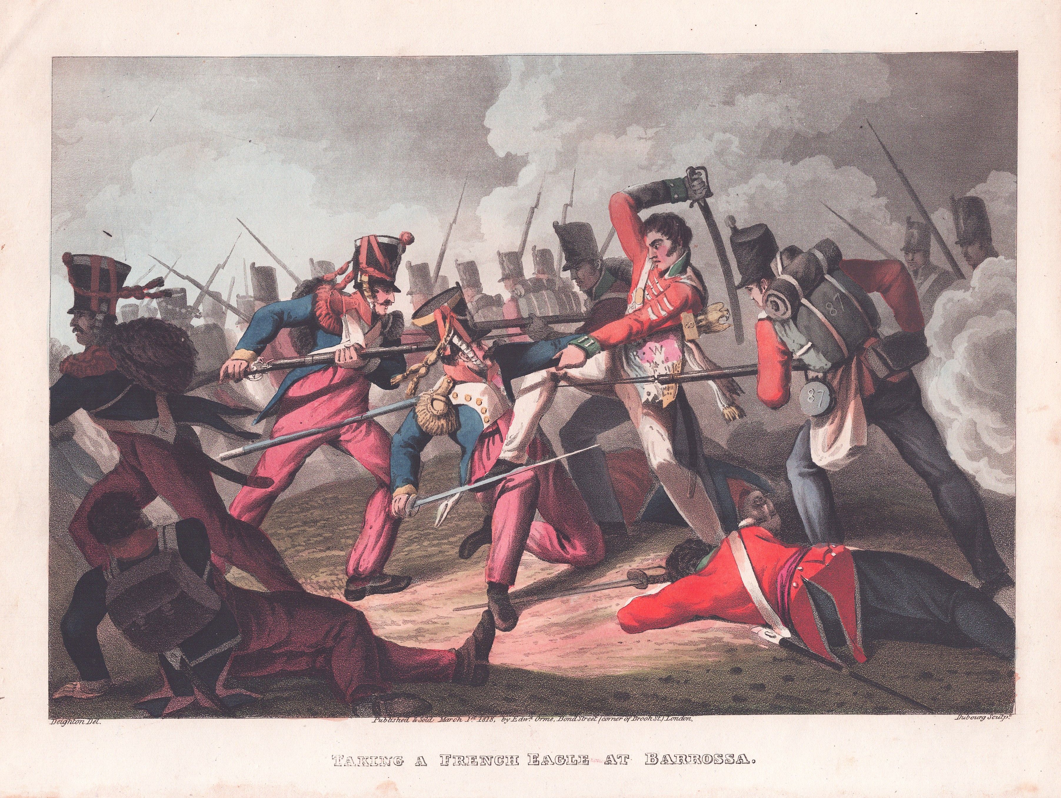An antique aquatint engraving by Matthew Dubourg after Deighton. Published by Edward Orme in 1819 with original hand colouring. Sergeant Patrick Masterson of the 87th (Royal Irish Fusiliers) Regiment of Foot captured the Imperial Eagle of the French 8th Regiment of the Line. The capture of this Eagle was a major, morale-boosting victory for the British forces against Napoleon's army.