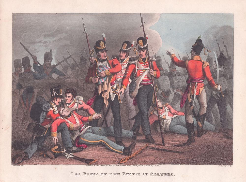 An antique aquatint engraving by Matthew Dubourg after Manskirch. Published by Edward Orme in 1819 with original hand colouring. Lieutenant Matthew Latham of the 3rd (East Kent) Regiment of Foot (The Buffs) was severely wounded, trying to protect the King's Colour. He tore the flag from the staff, hid it in his jacket, and was left for dead, but survived.