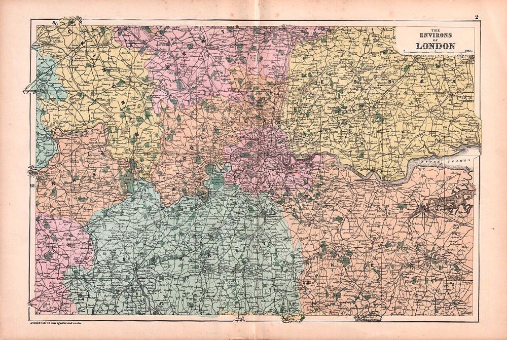 An antique map published by G.W. Bacon & Co. Ltd, London. Circa 1895. Includes sections of Berkshire, Buckinghamshire, Middlesex, Essex, Surrey and Kent.Appreox 46cms by 30.5cms.