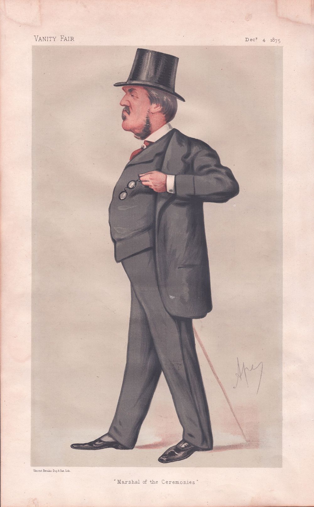An antique print entitled " Marshal off the Ceremonies. " was produced for the famous Victorian Magazine "Vanity Fair" founded by Thomas Gibson Bowles which commenced publication in 1869. The prints were produced in colour by chromo-lithography by Vincent Brooks, and Day and Son. For about forty five years caricatures of famous and infamous personalities were carried in the weekly issues of Vanity Fair. Subjects included Royalty, judges, politicians, musicians, sportsmen, artists, actors and criminals of Victorian and Edwardian Britain. This print by 'Ape' was published on December 4th, 1875.