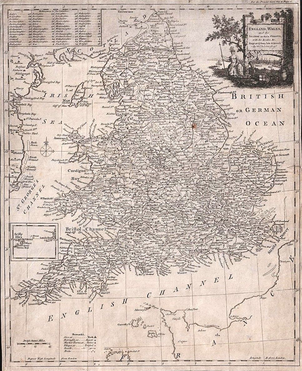 An antique map England and Wales "Engraved from Late Survey's by Thos. Kitchin Geog." Eastern coast of Ireland and Northern coast of France are shown. Reference to the counties in top left corner. Inset map of the Scilly Isles bottom left. Circa 1770.