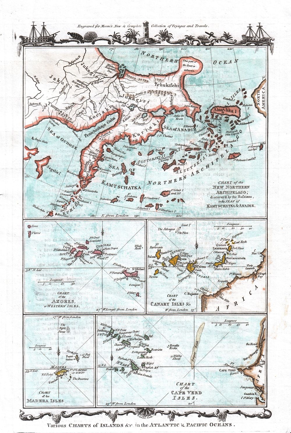 Five antique sea chart "Engraved for Moore's New and Complete Collection of Voyages and Travels." Engraved by T. Conder. Published by Alexander Hogg London, 1785 with later hand colouring. Some offsetting of print from adjoining page.