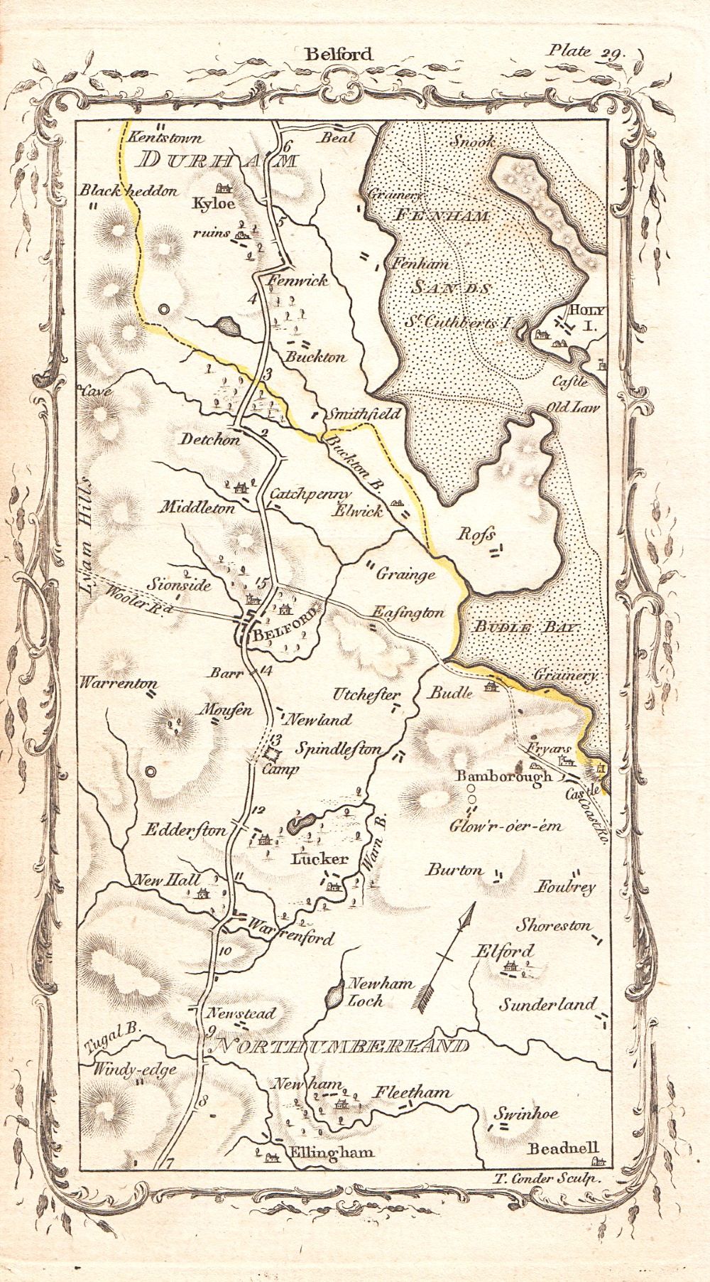 A scarce antique road map from "An Actual Survey of the Great Post-Roads between London and Edinburgh with the Country three Miles on each side" by Mostyn John Armstrong, published in 1776. Each map shows a section of the road from London to Edinburgh drawn on the scale of half an inch to the mile. These maps are not strip road maps, but take the form of a conventional map covering an area of approximately 12 miles from south to north and 7 miles east to west. This is Plate 29 - From Warrenford to Belford and North via Fenwick. Includes free mounting on request.
