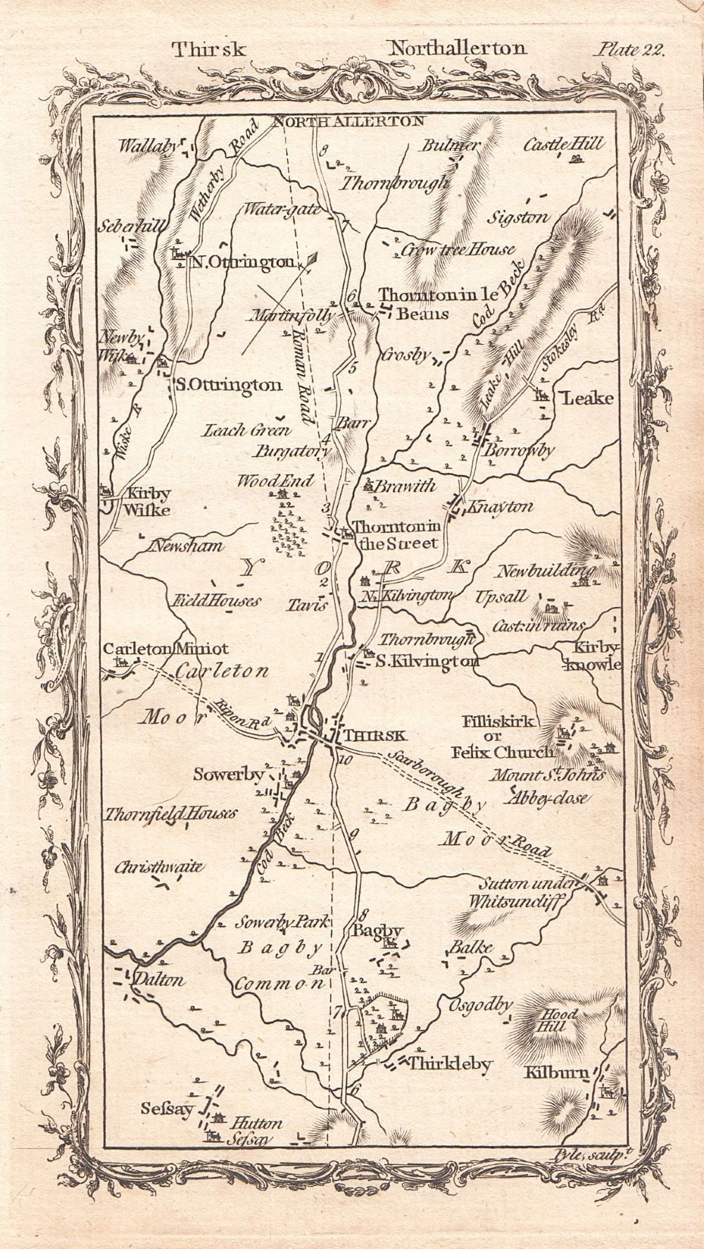 A scarce antique road map from "An Actual Survey of the Great Post-Roads between London and Edinburgh with the Country three Miles on each side" by Mostyn John Armstrong, published in 1776. Each map shows a section of the road from London to Edinburgh drawn on the scale of half an inch to the mile. These maps are not strip road maps, but take the form of a conventional map covering an area of approximately 12 miles from south to north and 7 miles east to west. This is Plate 22 - Thirkleby, Thirsk to North Allerton. Includes free mounting on request.