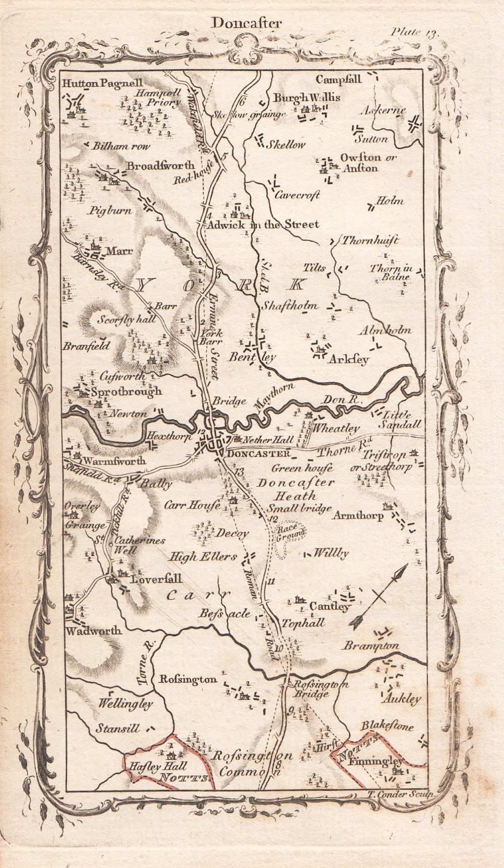 A scarce antique road map from "An Actual Survey of the Great Post-Roads between London and Edinburgh" by Mostyn John Armstrong, published in 1776. Each map shows a section of the road from London to Edinburgh drawn on the scale of half an inch to the mile. These maps are not strip road maps, but take the form of a conventional map covering an area of approximately 12 miles from south to north and 7 miles east to west. This is Plate 13 - Rossington Common, Doncaster to Adwick in the Street. Includes free mounting on request.